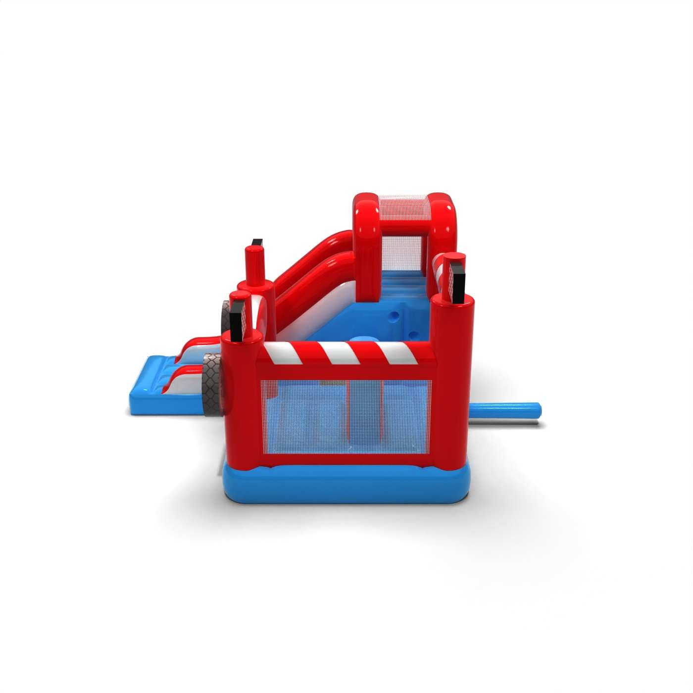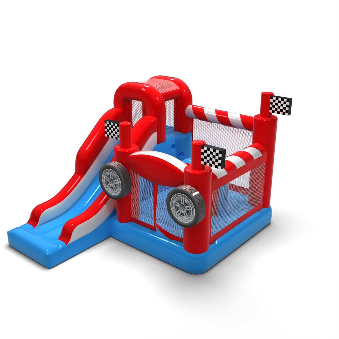 Závodná atmosféra a energický dizajn dodávajú tejto atrakcii dynamický charakter, ktorý rýchlo upúta pozornosť detí. Kombinácia skákania a šmykľavky poskytuje rozmanitú zábavu a prirodzené striedanie účastníkov. Motorizované vizuálne akcenty umocňujú dojem pohybu a súťaženia v ľahkej, detskej forme. Je to všestranná možnosť pre požičovne slúžiace na rodinné podujatia a tematické hracie plochy. Nafukovačka je ideálna na festivaly, pikniky a podujatia inšpirované automobilovým svetom.