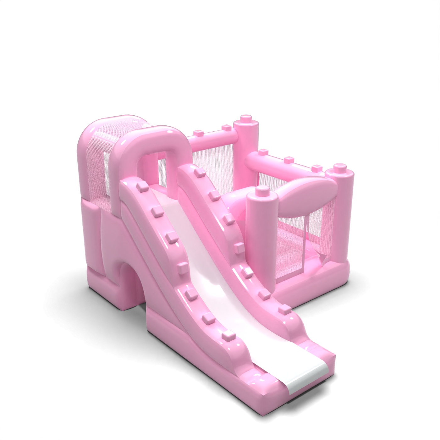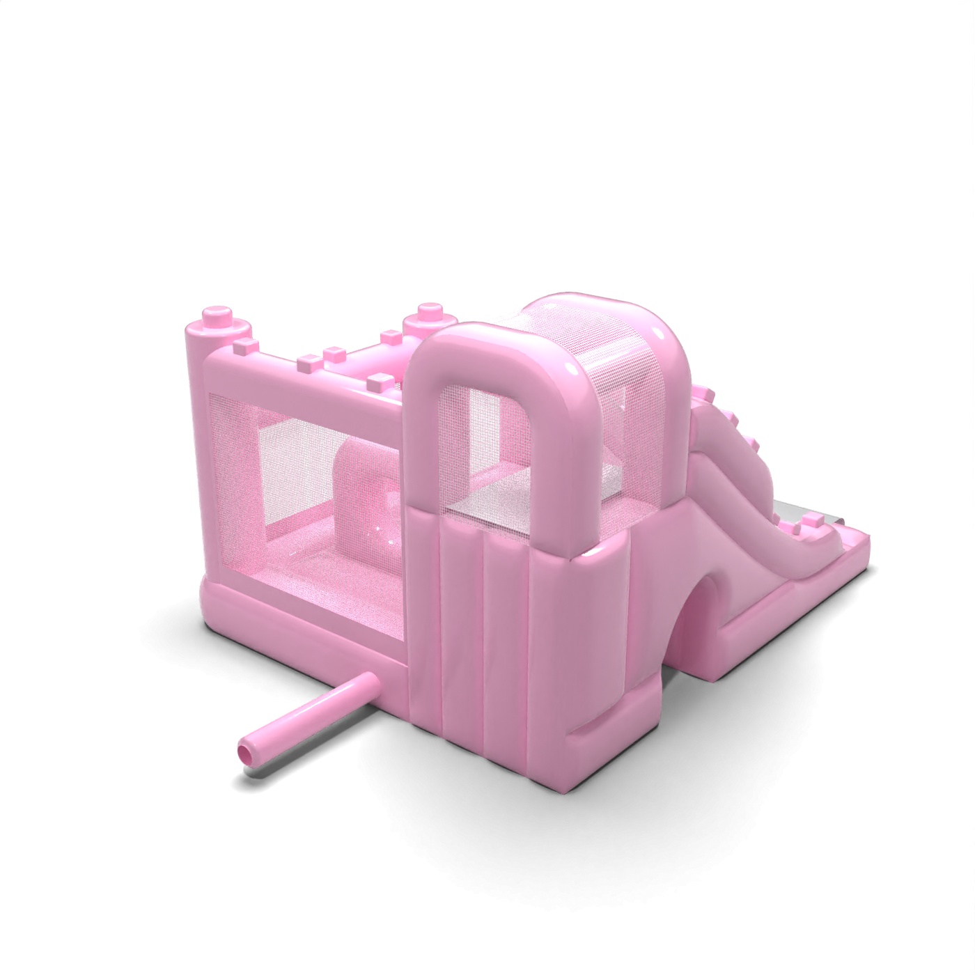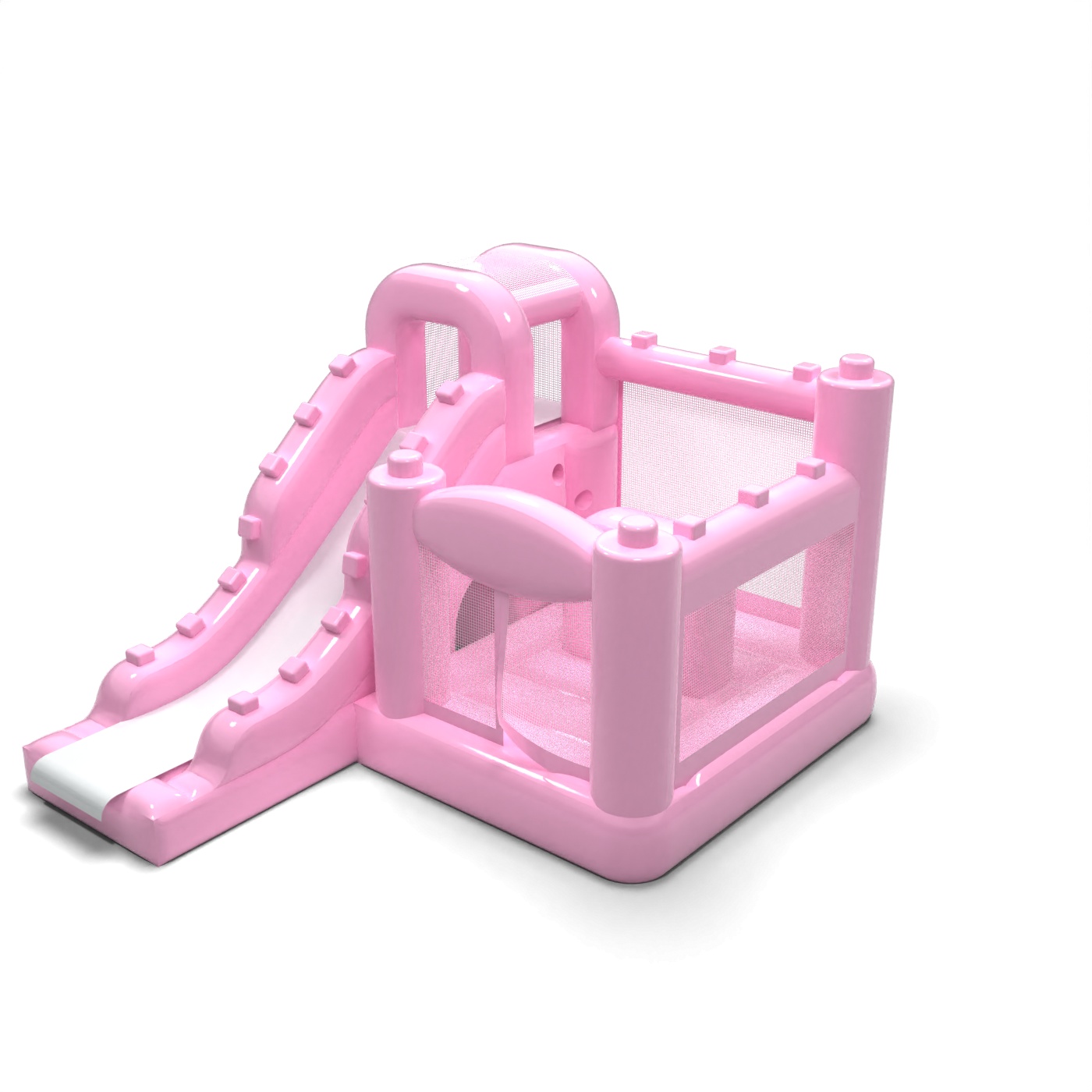 Jemná karoséria v púdrovo ružovej farbe vnáša do detského kútika pokojnú a harmonickú atmosféru, ktorá podporuje rodinnú atmosféru podujatia. Interiér s priestorom na skákanie a bočne vedenou šmýkačkou umožňuje deťom prirodzený pohyb medzi aktivitami bez toho, aby vznikali zápchy. Konštrukcia bola navrhnutá tak, aby maximálne využila malú plochu a zároveň zachovala komfort pri hre. Toto riešenie bude dobre fungovať pre požičovne slúžiace materským školám, hotelové animácie a komorné podujatia v exteriéri. Model sa najlepšie hodí na projekty, kde je dôležitá jemná estetika a prívetivosť atrakcie pre deti.