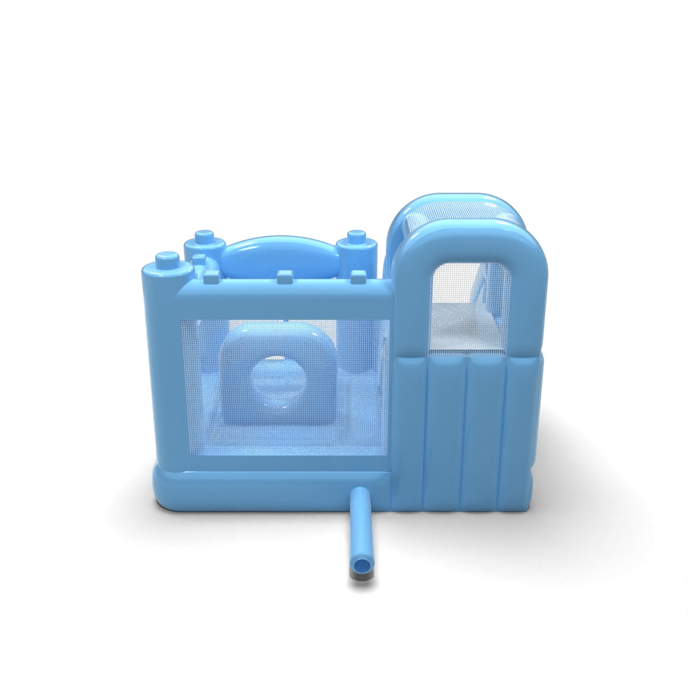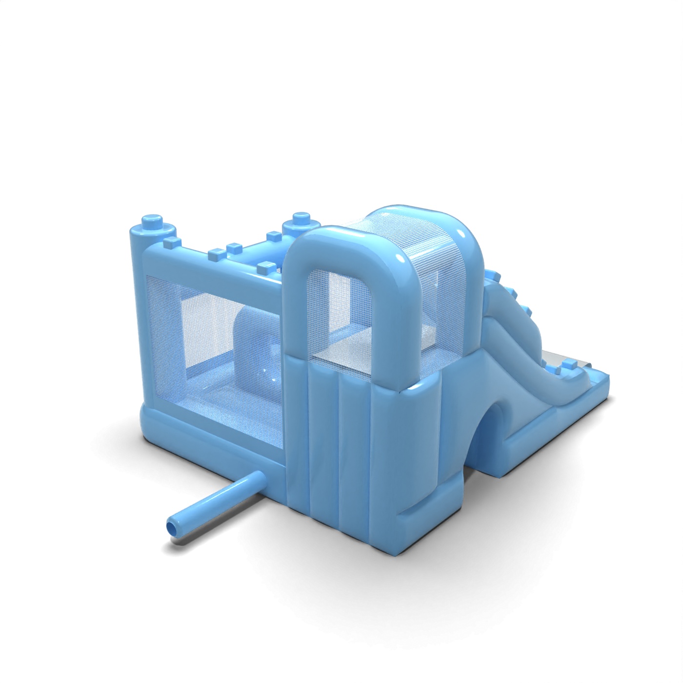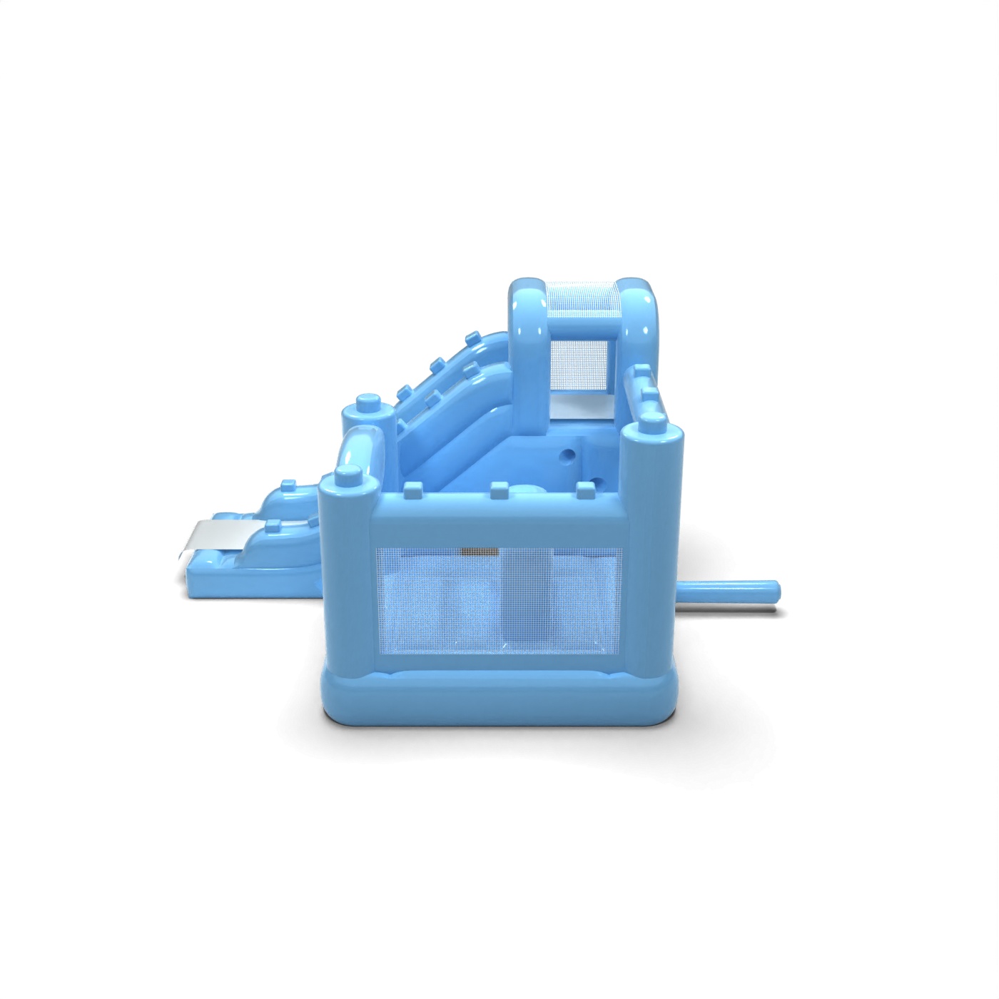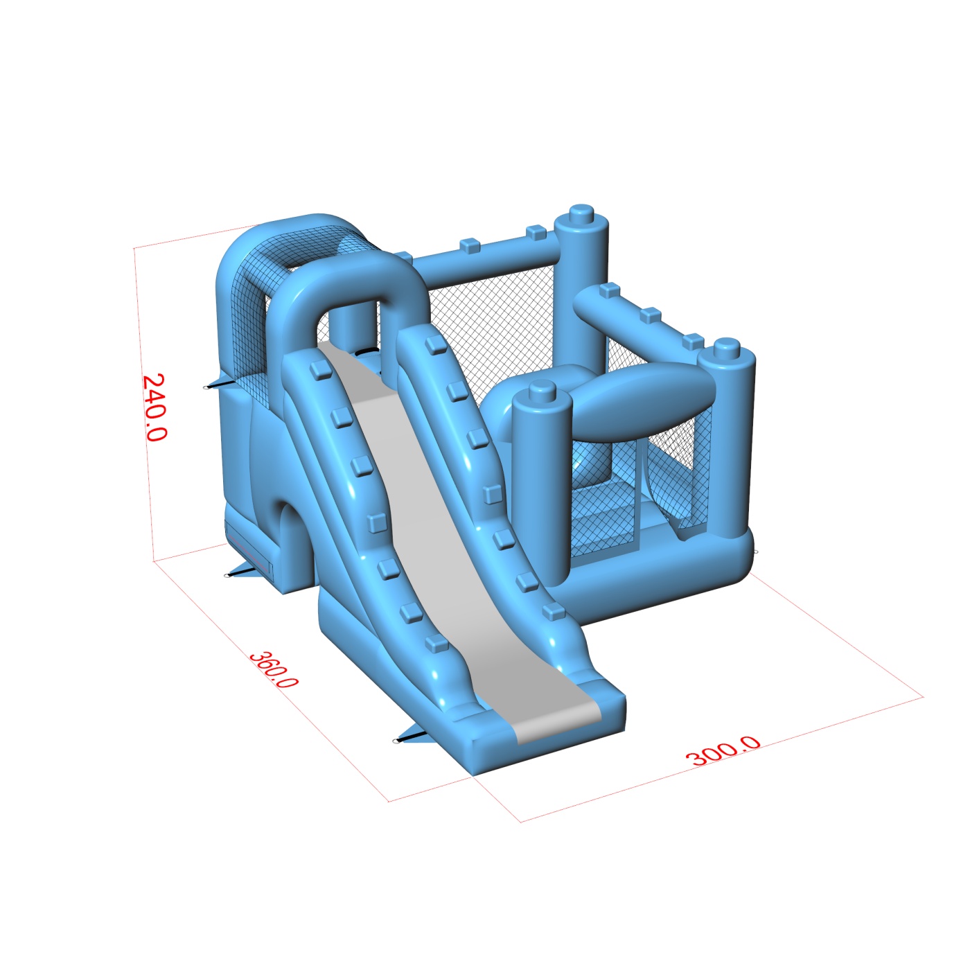 Pastelová modrá dodáva tejto atrakcii svieži, neutrálny vzhľad, ktorý sa dá ľahko zladiť s rôznymi vizuálnymi koncepciami podujatia. Konštrukcia s jedným telom kombinujúca skákanie a kĺzanie umožňuje deťom aktívne využívať nafukovačku bez toho, aby bolo potrebné rozdeliť priestor na niekoľko zón. Premyslené usporiadanie vstupov a výstupov podporuje plynulé striedanie účastníkov počas podujatia. Ide o praktickú možnosť pre spoločnosti organizujúce podujatia a požičovne zabezpečujúce súkromné oslavy aj menšie B2B produkcie. Atrakcia sa bude dobre hodiť na firemné pikniky, detské dni a podujatia organizované v polootvorených priestoroch a pod prístreškom.