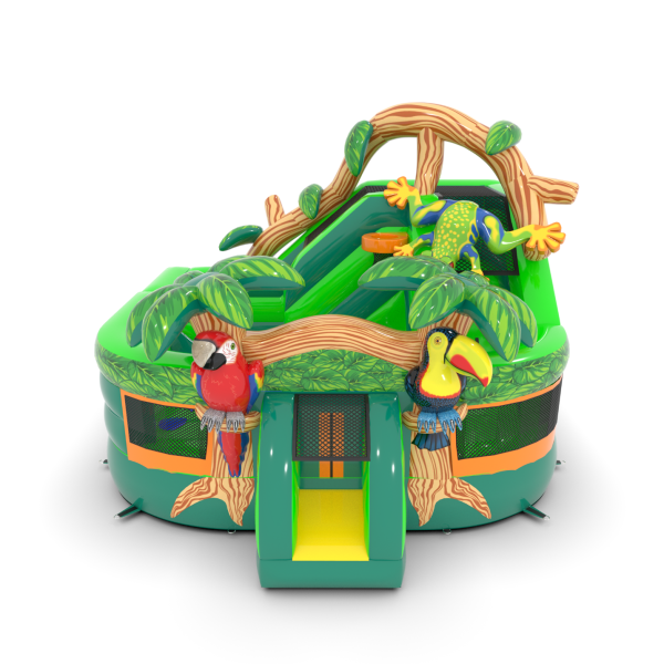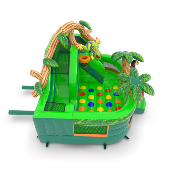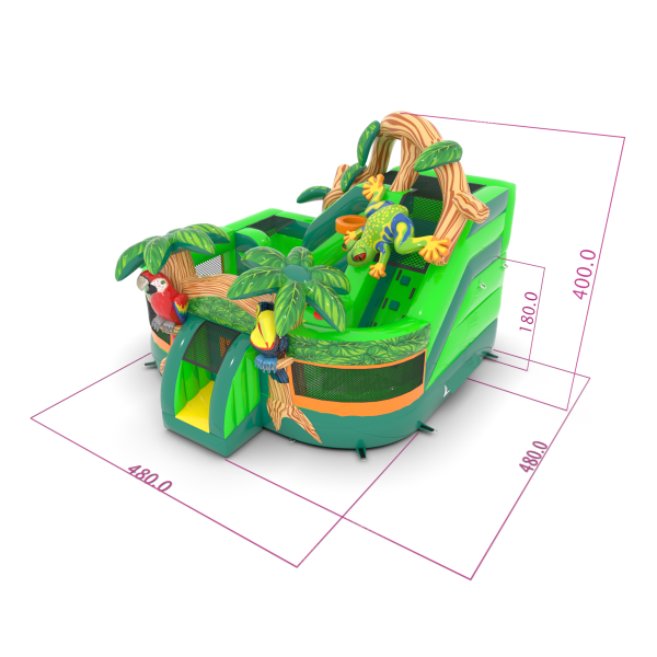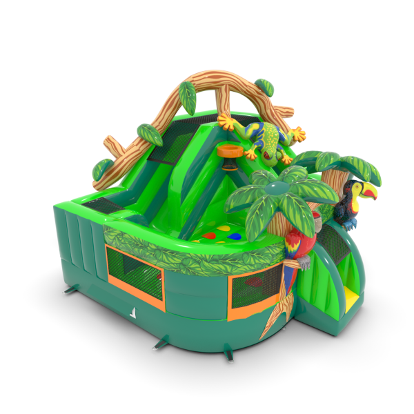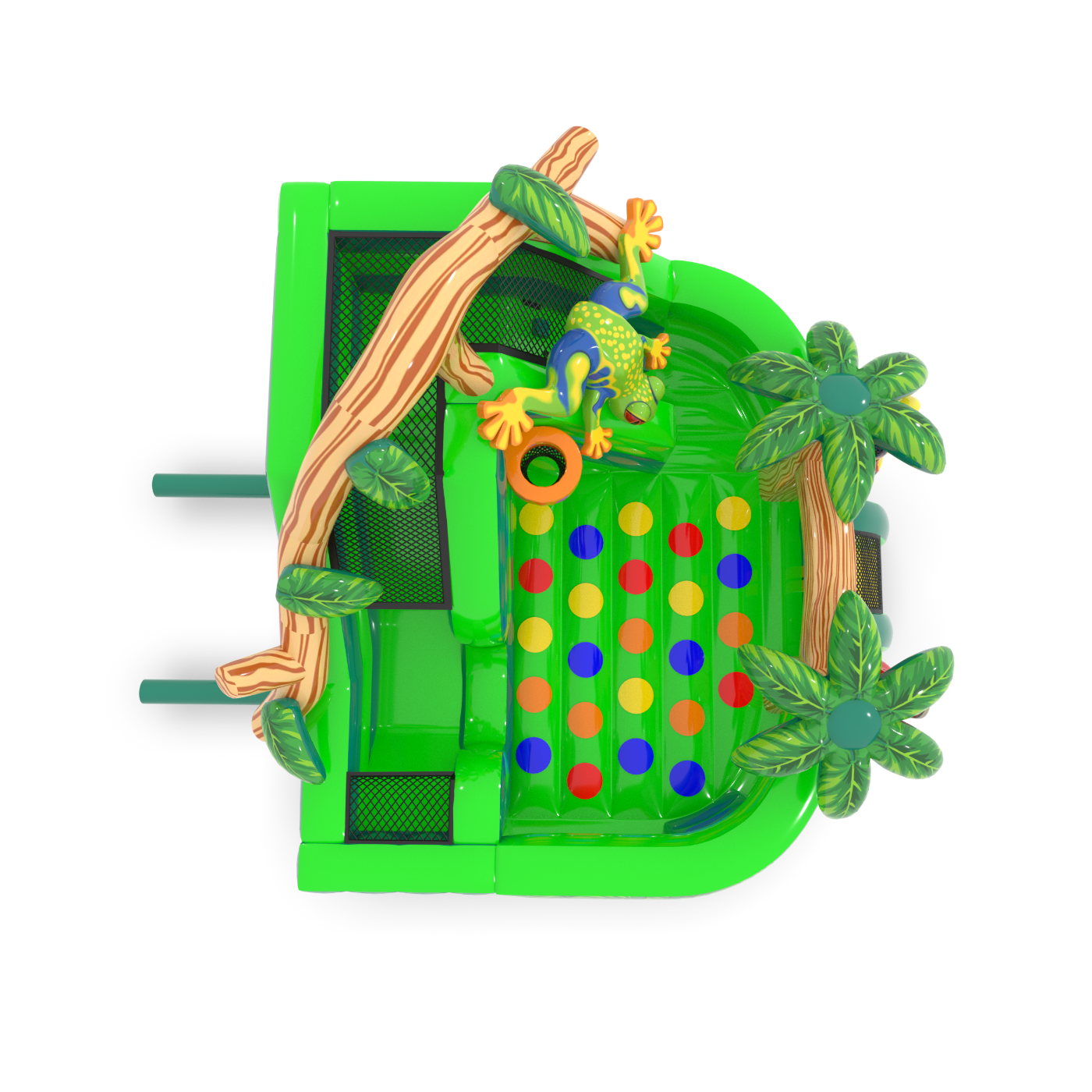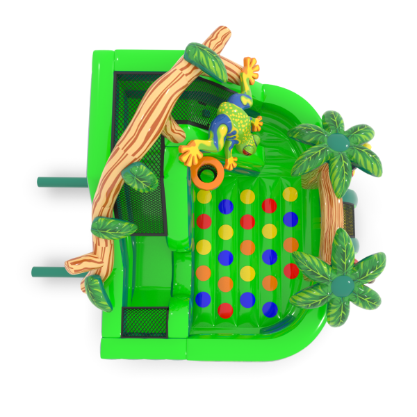 Nafukovacie ihrisko "žaba" s motívom džungle je určený predovšetkým pre deti, ktoré hľadajú dobrodružstvo pri hre s kamarátmi a rovesníkmi. Nafukovacie ihrisko je uzavreté a odpružené, čo zaručuje jeho úplnú bezpečnosť. Zvyčajne obsahuje veľkú aj malú šmykľavku, takže ponúka skvelú zábavu pre deti rôzneho veku. Nafukovacie ihrisko "žaba" s motívom džungle je výbornou voľbou na rodinné pikniky, firemné a teambuildingové podujatia či iné akcie — vonku aj v interiéri. Nafukovacie ihriská sú skvelou alternatívou k väčším a náročnejším atrakciám. Túto atrakciu odporúčame najmä tým, ktorí práve začínajú podnikanie v oblasti prenájmu alebo organizácie podujatí.