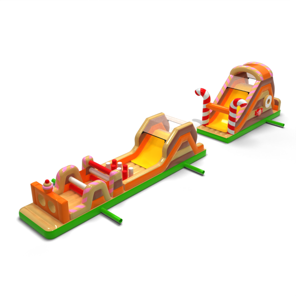 Nafukovacia prekážková dráha Bonbóny - 20 m je určený pre takmer každého, kto si rád užíva dobrú zábavu spojenú s troškou súťaženia. Nafukovacia prekážková dráha bola vytvorená predovšetkým s ohľadom na tínedžerov a dospelých, no je vhodná aj pre deti od 6 rokov. Takmer každý si na tejto atrakcii nájde prvky, ktoré prinášajú radosť a vzrušenie. Tento produkt odporúčame všetkým, ktorí chcú prebudiť svoj súťažný duch počas hodín aktívnej zábavy vonku. Atrakcie v tejto sérii môžu obsahovať rôzne prvky s odlišnými úrovňami náročnosti. Vylezte na stenu, spustite sa rýchlou šmykľavkou a prelezte medzi výstupkami, ktoré sťažujú čo najrýchlejšie dokončenie dráhy.