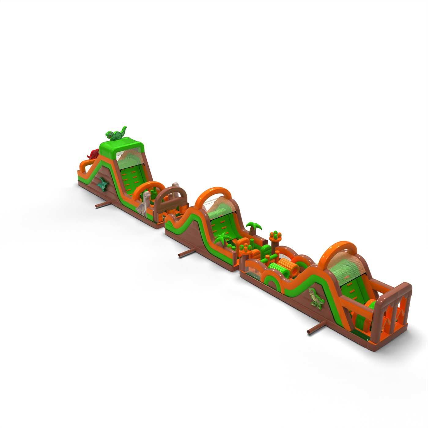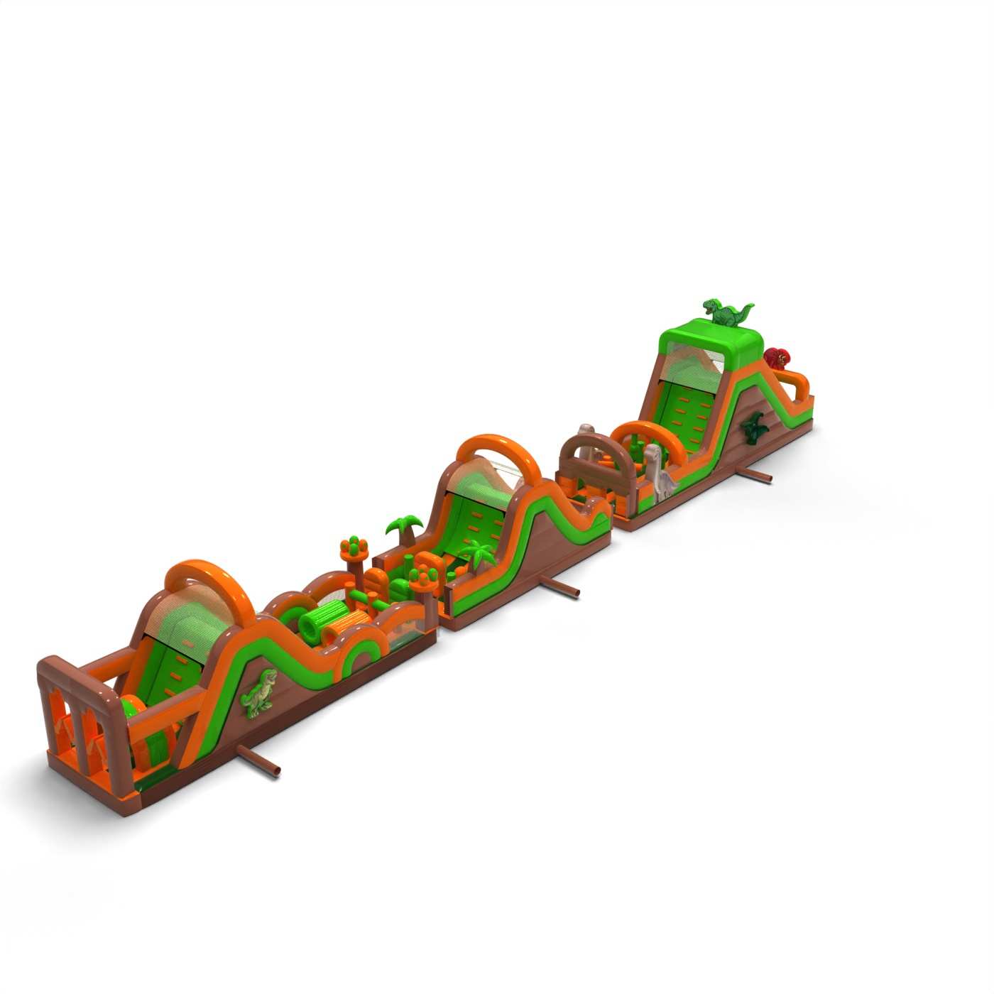 Nafukovacia prekážková dráha s dinosaurami - 30 m je určený pre takmer každého, kto si rád užíva dobrú zábavu spojenú s troškou súťaženia. Nafukovacia prekážková dráha bola vytvorená predovšetkým s ohľadom na tínedžerov a dospelých, no je vhodná aj pre deti od 6 rokov. Takmer každý si na tejto atrakcii nájde prvky, ktoré prinášajú radosť a vzrušenie. Tento produkt odporúčame všetkým, ktorí chcú prebudiť svoj súťažný duch počas hodín aktívnej zábavy vonku. Atrakcie v tejto sérii môžu obsahovať rôzne prvky s odlišnými úrovňami náročnosti. Vylezte na stenu, spustite sa rýchlou šmykľavkou a prelezte medzi výstupkami, ktoré sťažujú čo najrýchlejšie dokončenie dráhy.