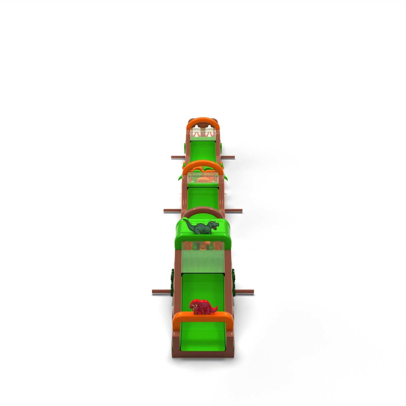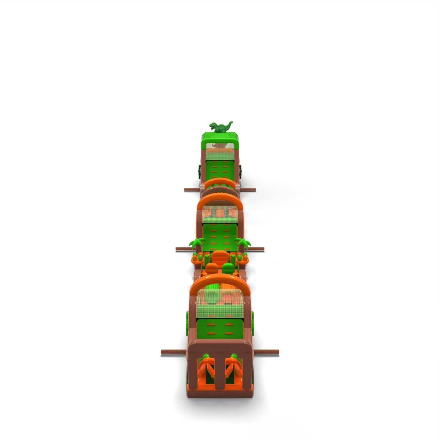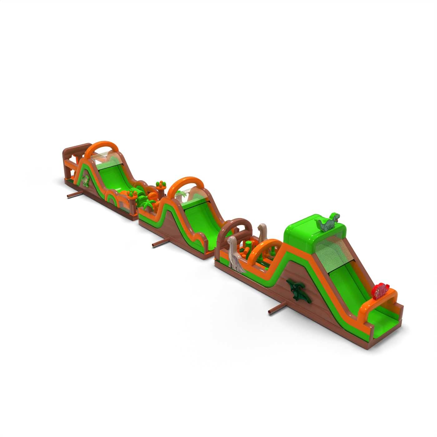 Monumentálna dráha v dinosaurej atmosfére vytvára veľkolepú zábavnú zónu, ktorá sa stáva ústredným bodom každého podujatia. Veľmi dlhá a rozmanitá prekážková dráha umožňuje intenzívne súťaženie, vysokú fluktuáciu účastníkov a dlhé udržanie záujmu o atrakciu. Ide o profesionálnu konštrukciu pripravenú na veľké podujatia, pri ktorých záleží na stabilite, odolnosti a bezproblémovej prevádzke. Tento typ dráhy je silným investičným produktom, ktorý si často vyberajú klienti hľadajúci veľké atrakcie s vysokým potenciálom zárobku. Najlepšie sa osvedčí pri masových podujatiach, festivaloch a veľkých vonkajších produkciách, kde je dôležitý rozsah, veľkoleposť a spoľahlivá kapacita počas celého dňa.