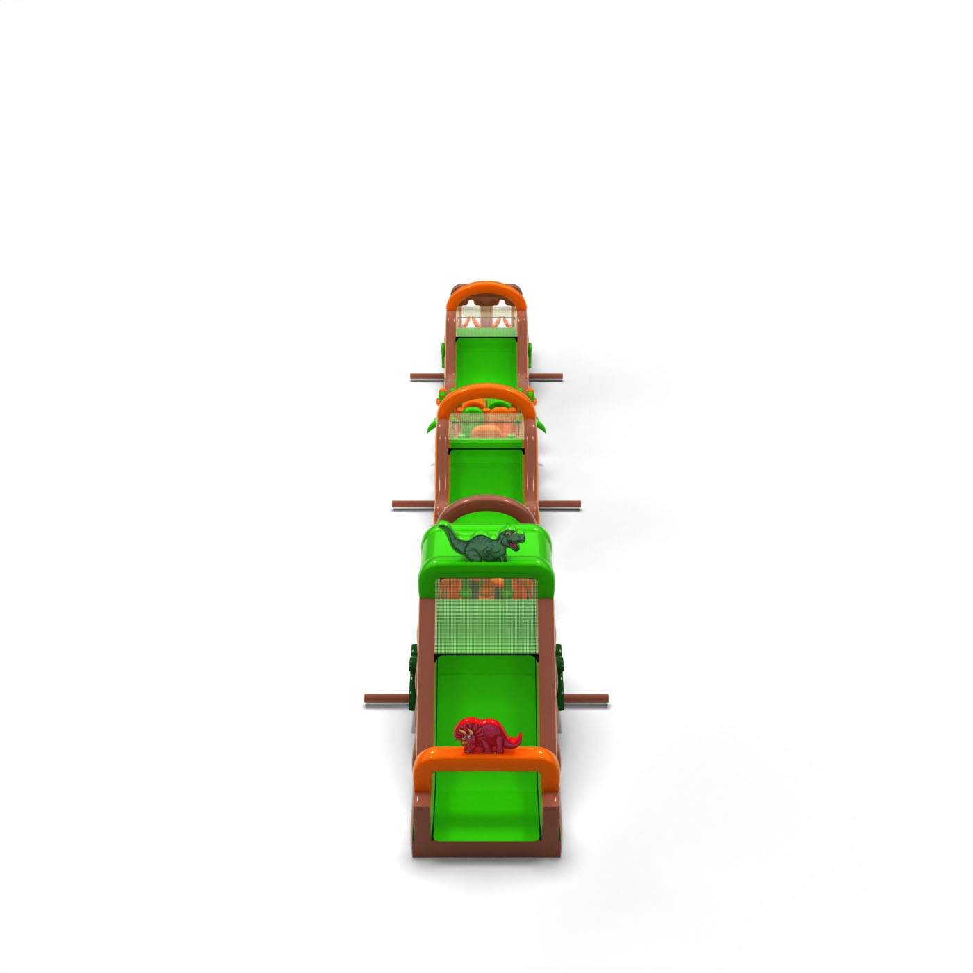 Monumentálna dráha v dinosaurej atmosfére vytvára veľkolepú zábavnú zónu, ktorá sa stáva ústredným bodom každého podujatia. Veľmi dlhá a rozmanitá prekážková dráha umožňuje intenzívne súťaženie, vysokú fluktuáciu účastníkov a dlhé udržanie záujmu o atrakciu. Ide o profesionálnu konštrukciu pripravenú na veľké podujatia, pri ktorých záleží na stabilite, odolnosti a bezproblémovej prevádzke. Tento typ dráhy je silným investičným produktom, ktorý si často vyberajú klienti hľadajúci veľké atrakcie s vysokým potenciálom zárobku. Najlepšie sa osvedčí pri masových podujatiach, festivaloch a veľkých vonkajších produkciách, kde je dôležitý rozsah, veľkoleposť a spoľahlivá kapacita počas celého dňa.