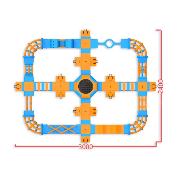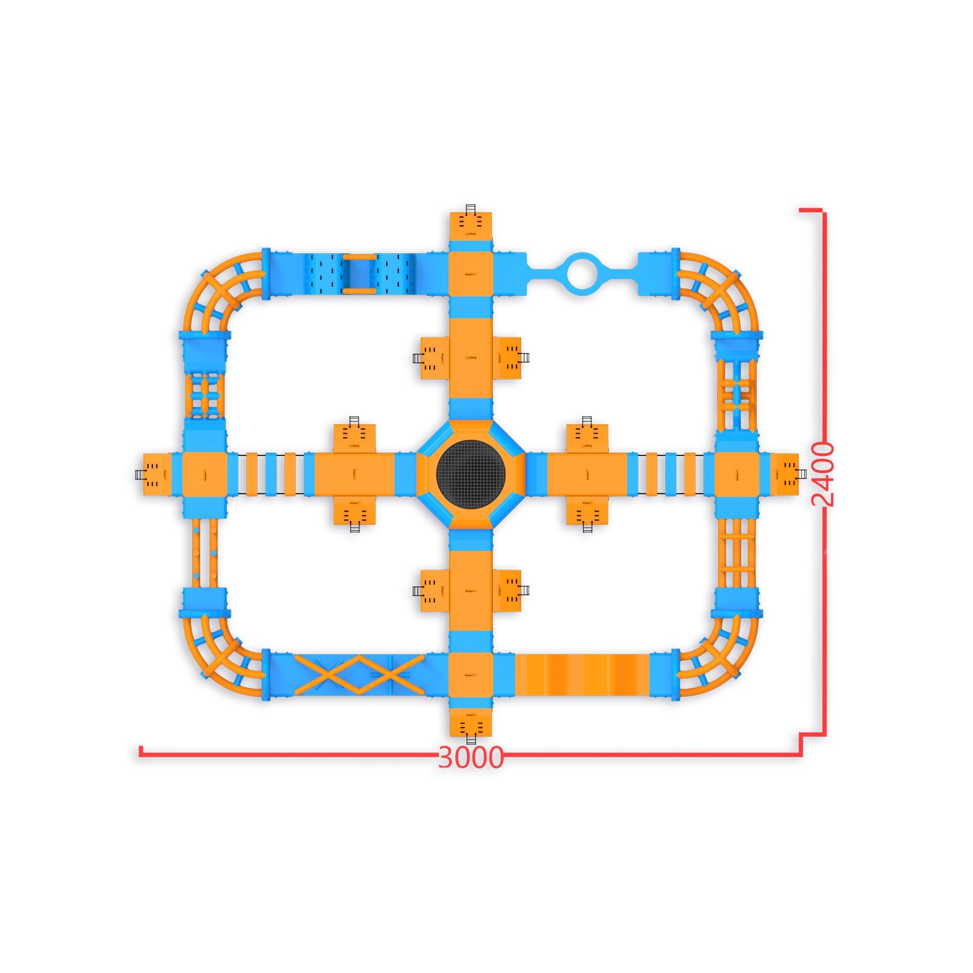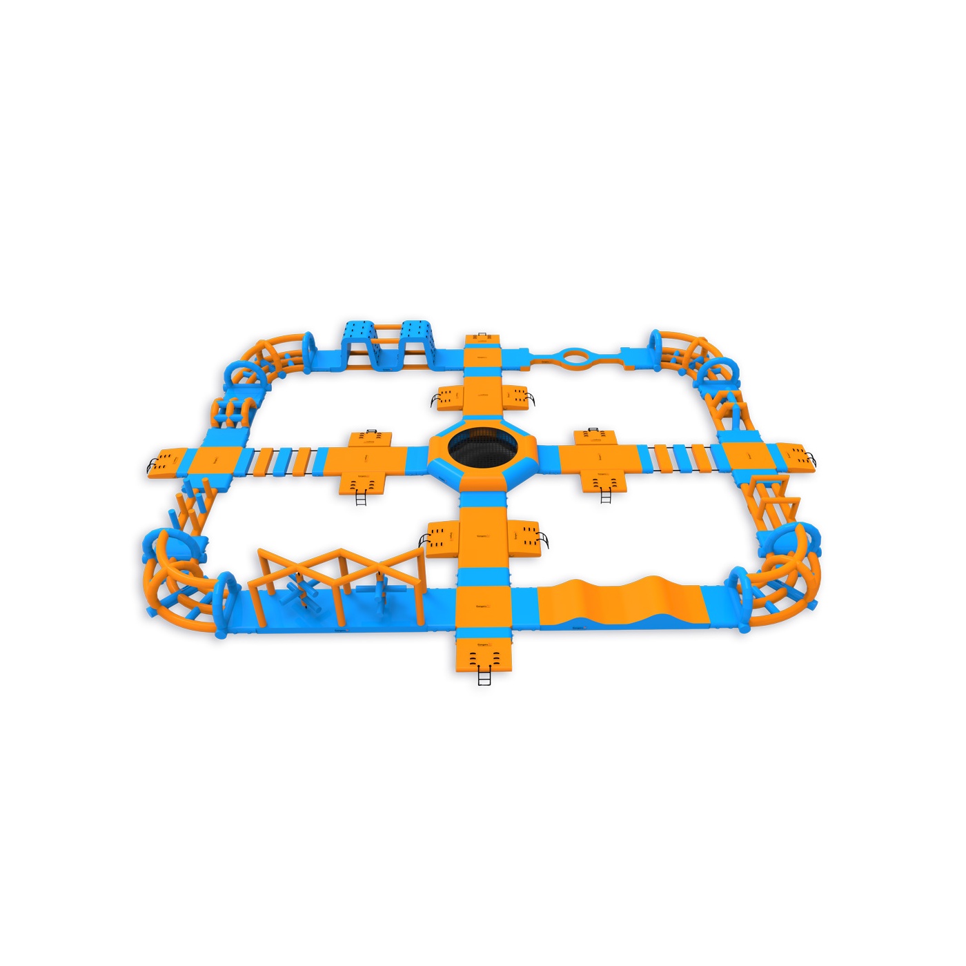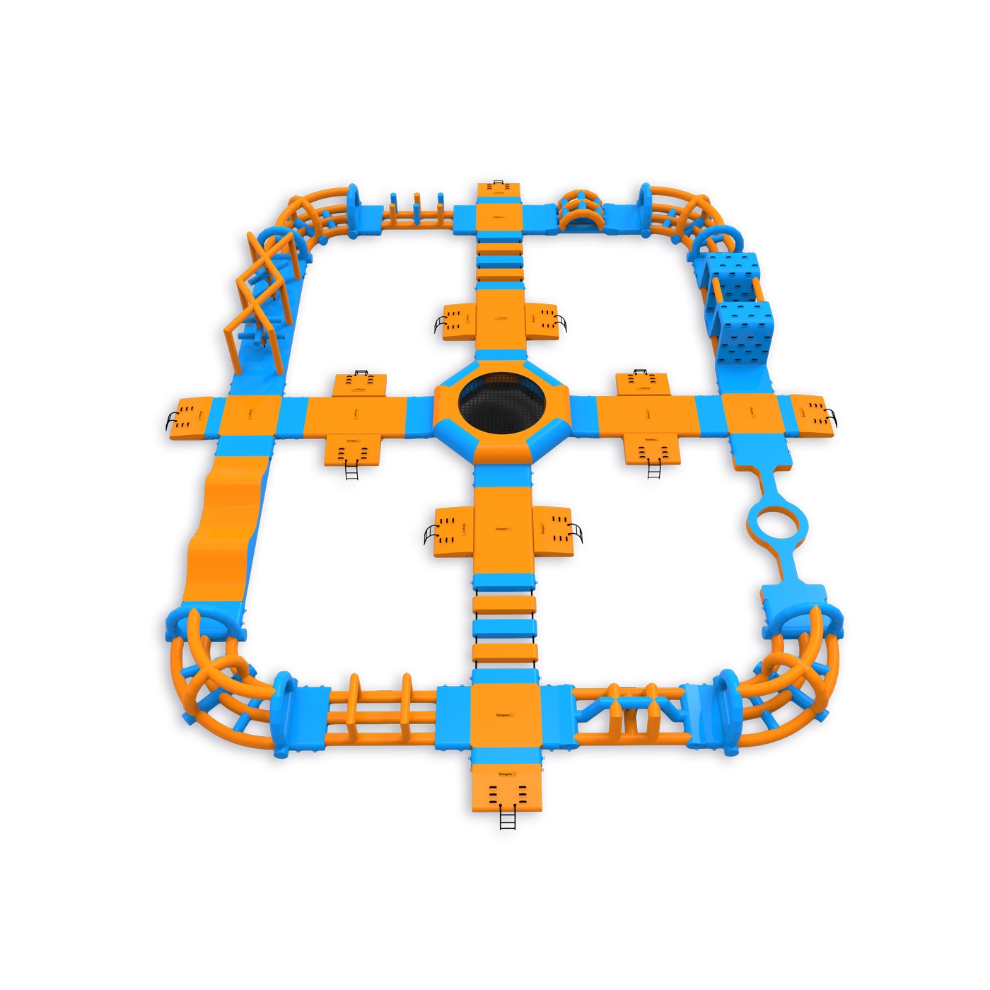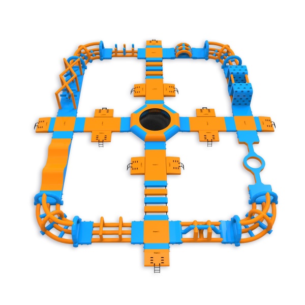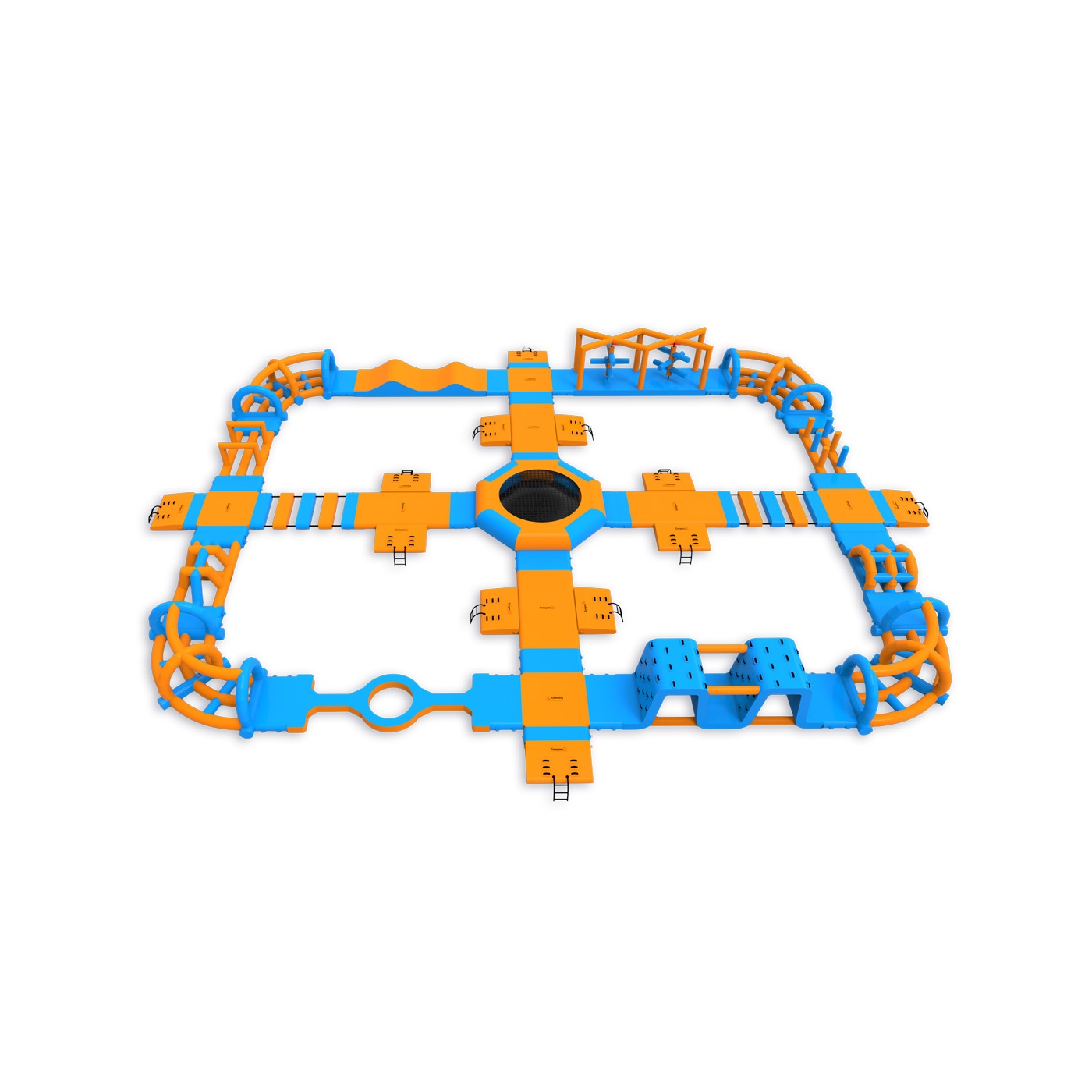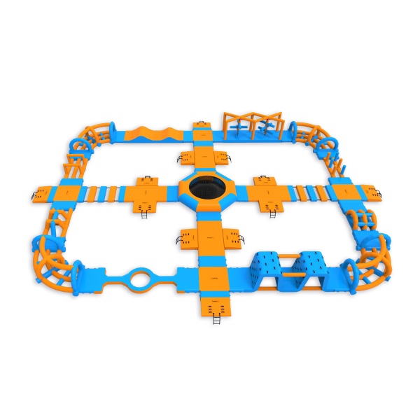 Trampolína v srdci parku - prvok, ktorý priťahuje účastníkov a organizuje pohyb po celej ploche. Obvodová prekážková dráha s plošinami, lezeckými prvkami, mostíkmi a kopcami poskytuje nepretržitú aktivitu pre skupiny až 76 osôb naraz. Dobre funguje na stredne veľkých vodných plochách, kde je dôležitý vysoký obrat a plné využitie sezóny.