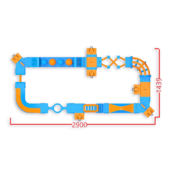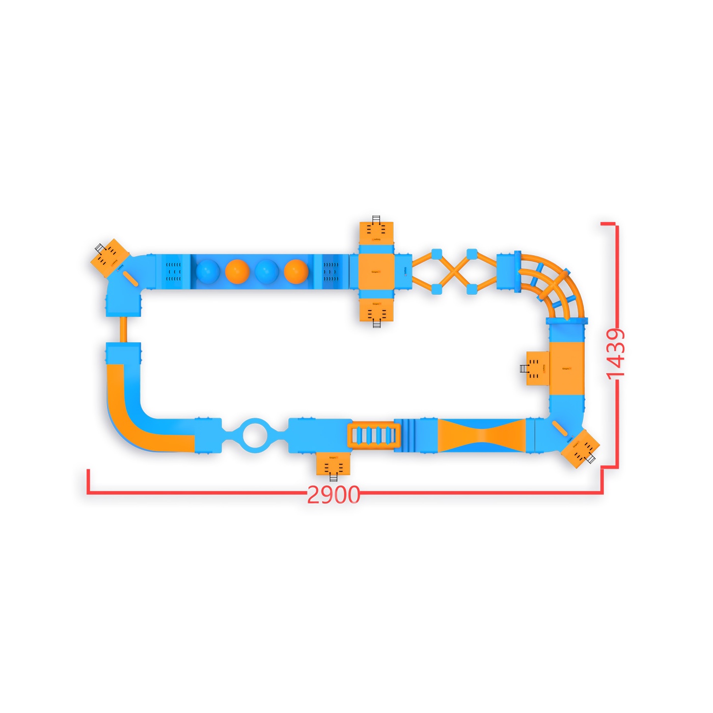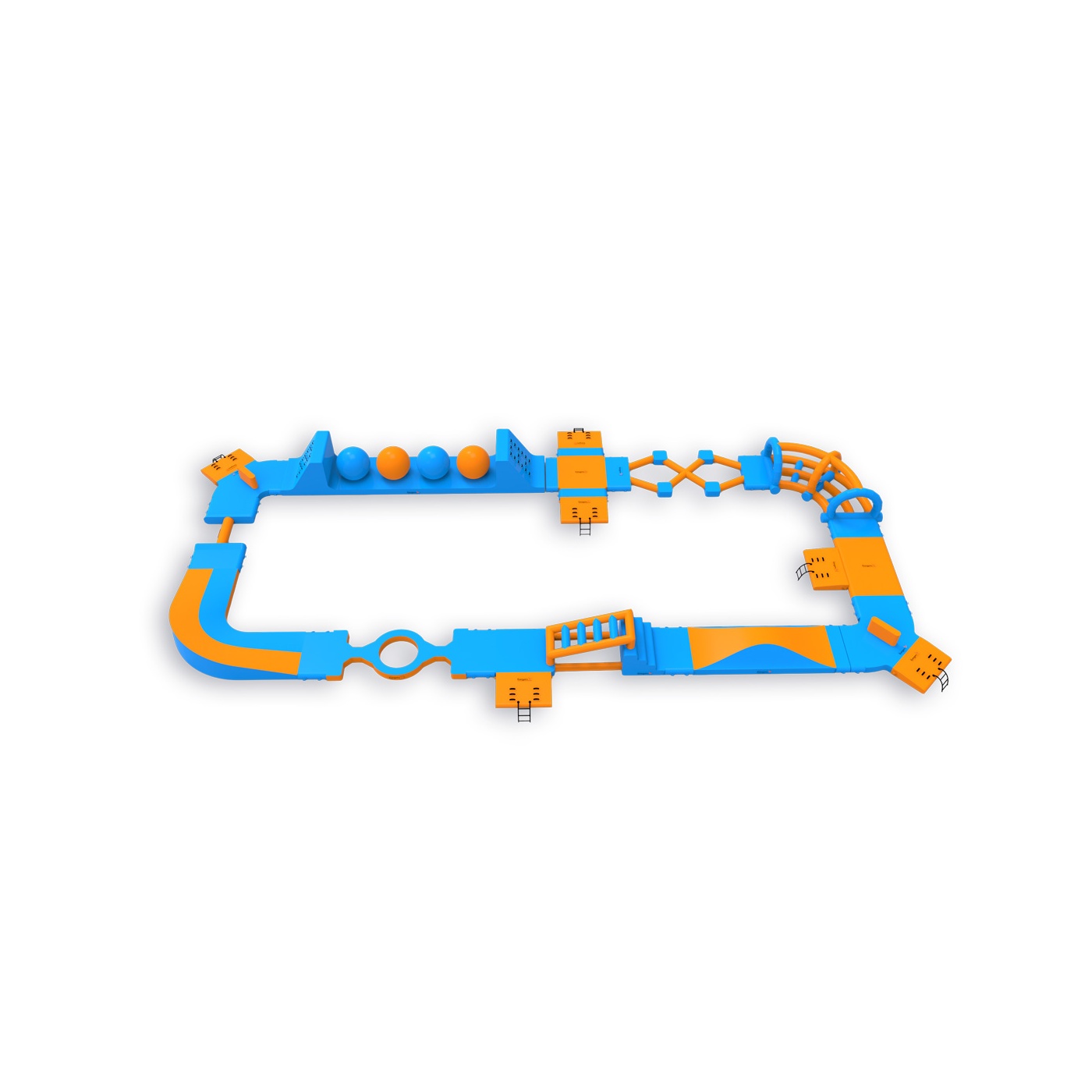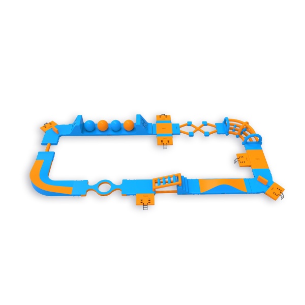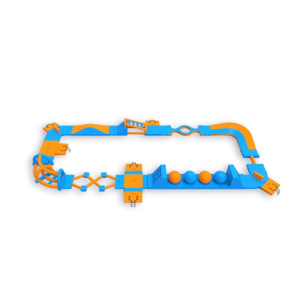 Štyri Wipeout lopty so skákacími plošinami - prvok, ktorý udrží účastníkov dlhšie zapojených a povzbudí ich k ďalším prístupom. Obvodová plocha s rozlohou 406 m² s prekážkami, schodmi a balančnými prvkami vedie cez po sebe idúce zóny aktivít a poskytuje prirodzený skupinový tok až 40 ľudí naraz. Dobre funguje na stredne veľkých vodných plochách, kde je dôležité mať k dispozícii atrakcie pre široký prierez hostí a vysokú fluktuáciu počas celého dňa.